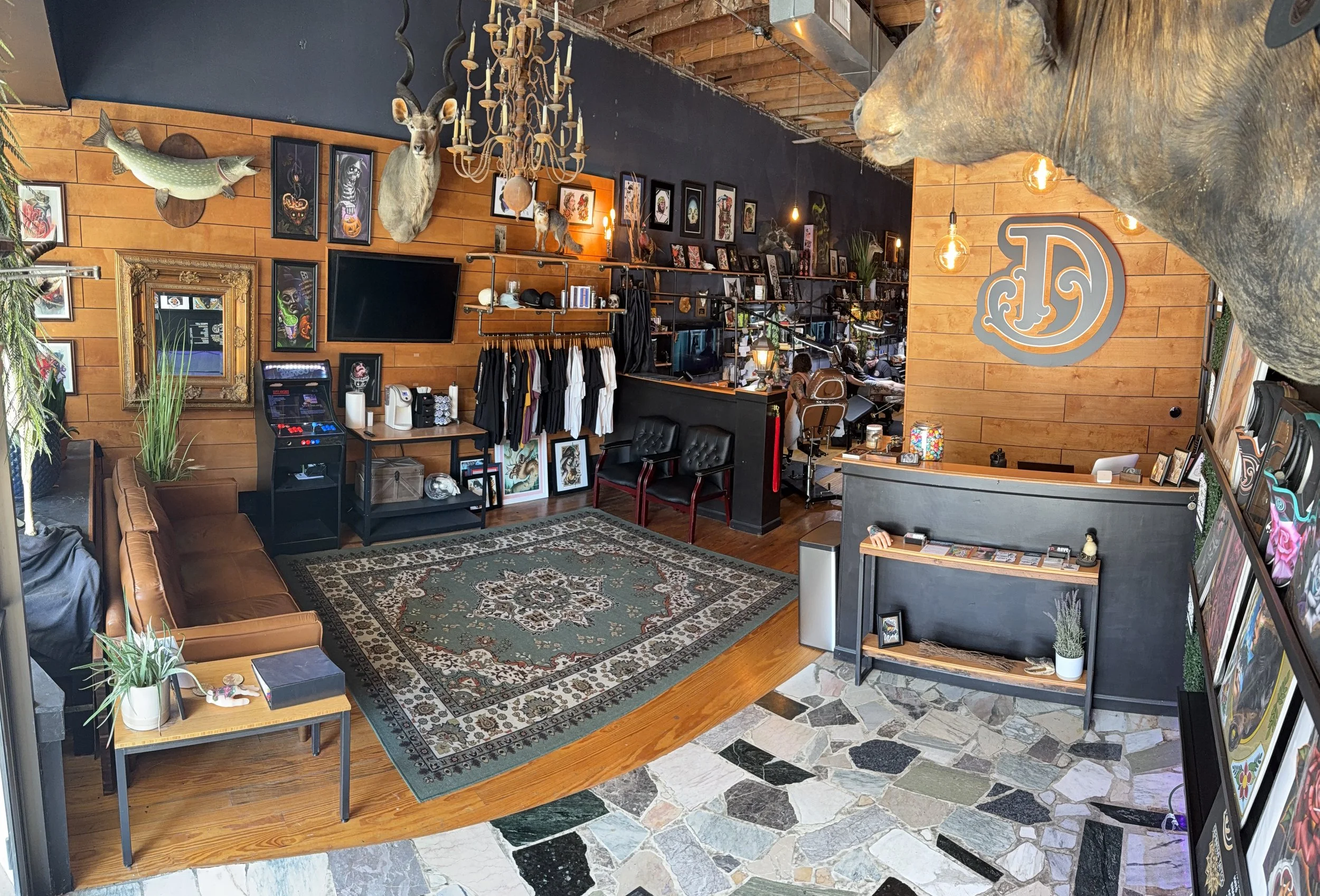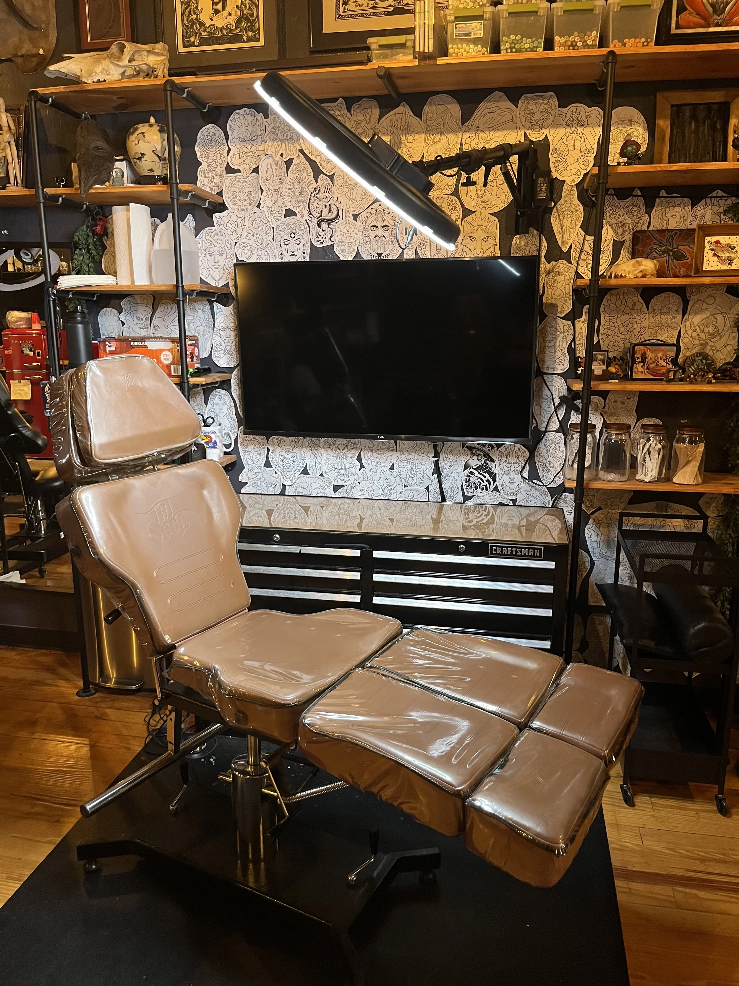 Definitive Tattoo Gallery is located in the Midwtown/Wesport area of Kansas City, MO. We keep the shop environment warm and inviting and do our best to offer the highest possible level of comfort and care. Our lobby is furnished with comfortable couches and chairs and we have coffee, tea, soda, and water available. Each artist’s station has its own TV and we always have music or movies playing to keep the mood lighthearted and fun. We know that also helps act as a distraction from the tattoo.