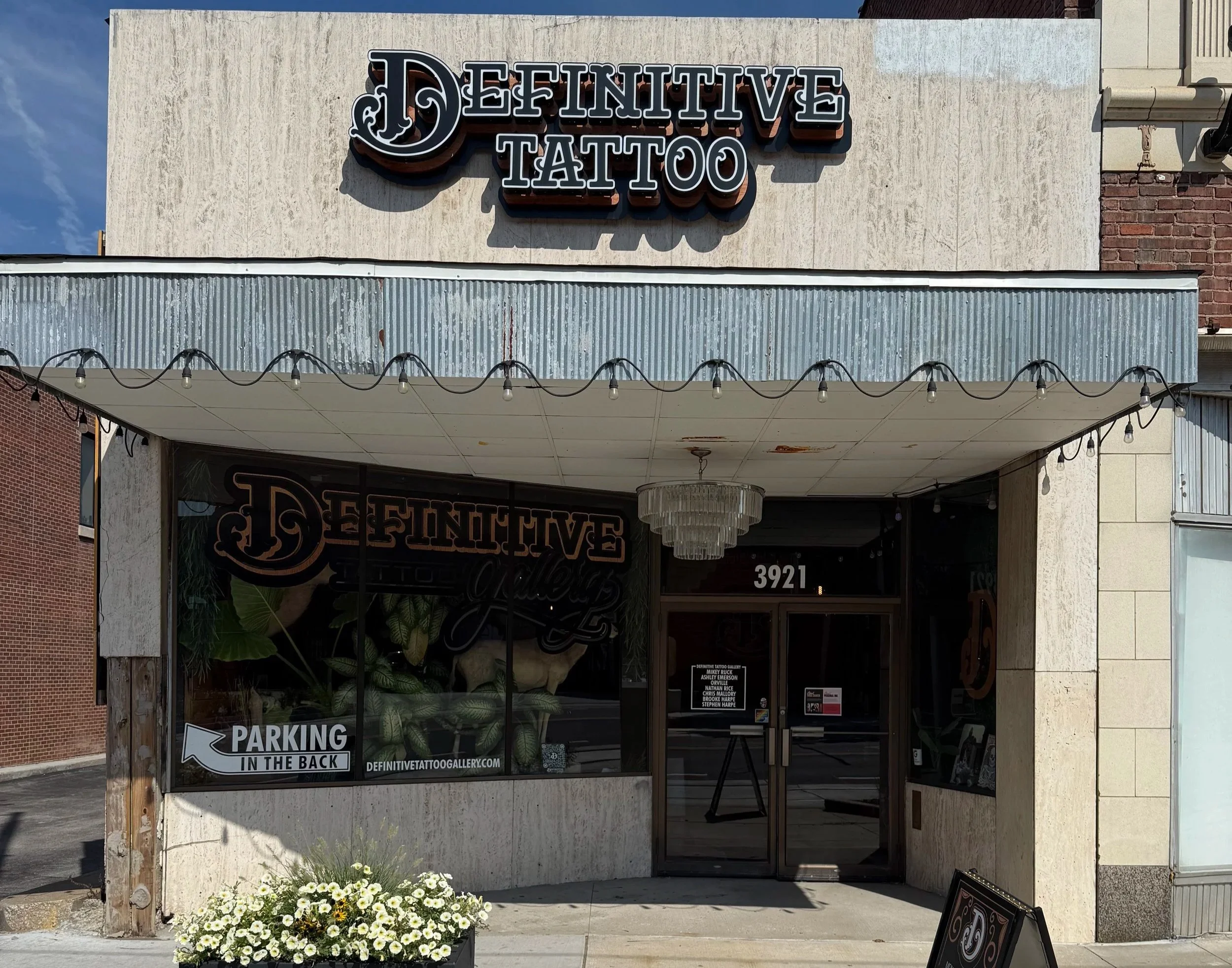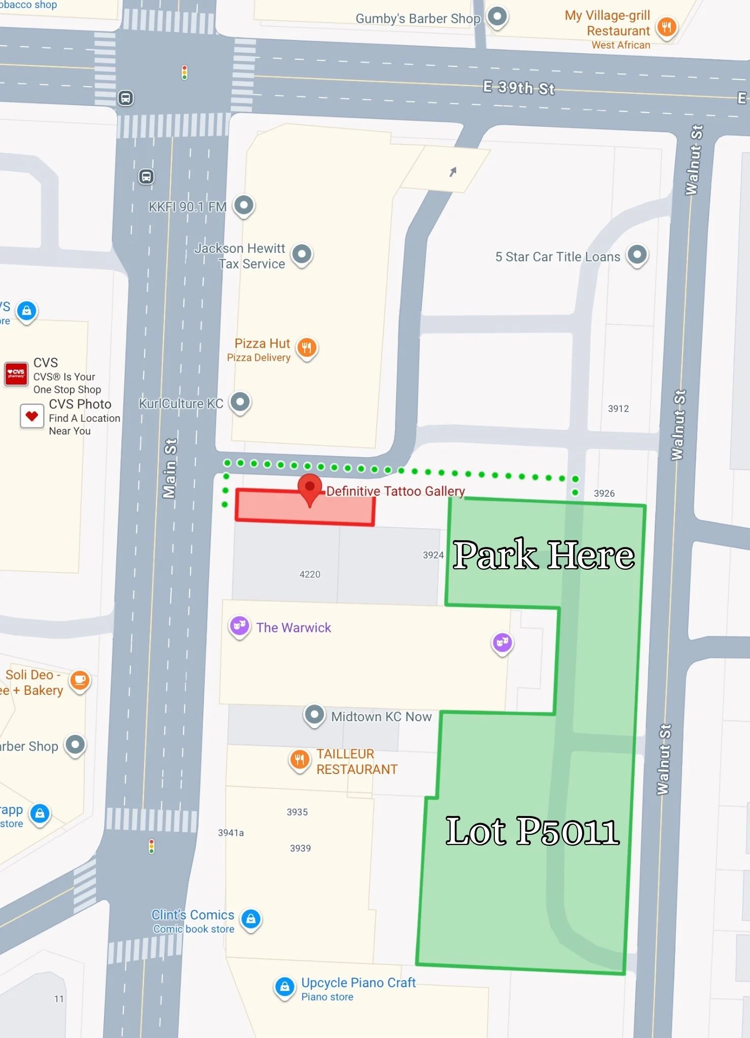 Definitive Tattoo is located at the corner of 39th & Main. Our address is 3921 Main St, Kansas City, MO 64111. There is plenty of parking that you are free to use behind the shop in Lot P5011 that we can validate for. You can access the lot from Walnut St. Please use the front entrance when you arrive but once you’re settled in you’re free to use the back porch and patio area to get some fresh air, eat a snack, or take phone calls. There are several food options within walking distance that we can recommend if you’d like to get lunch.